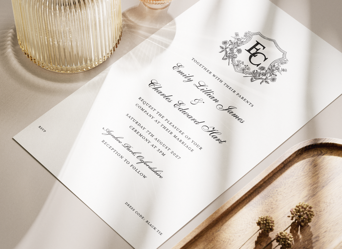 The Pembroke Suite features a refined monogram framed within an elegant shield and delicate botanical illustration, creating a sense of heritage and quiet grandeur. The structured layout and graceful calligraphy allow the couple’s names to take centre stage while the surrounding typography provides balance and formality.