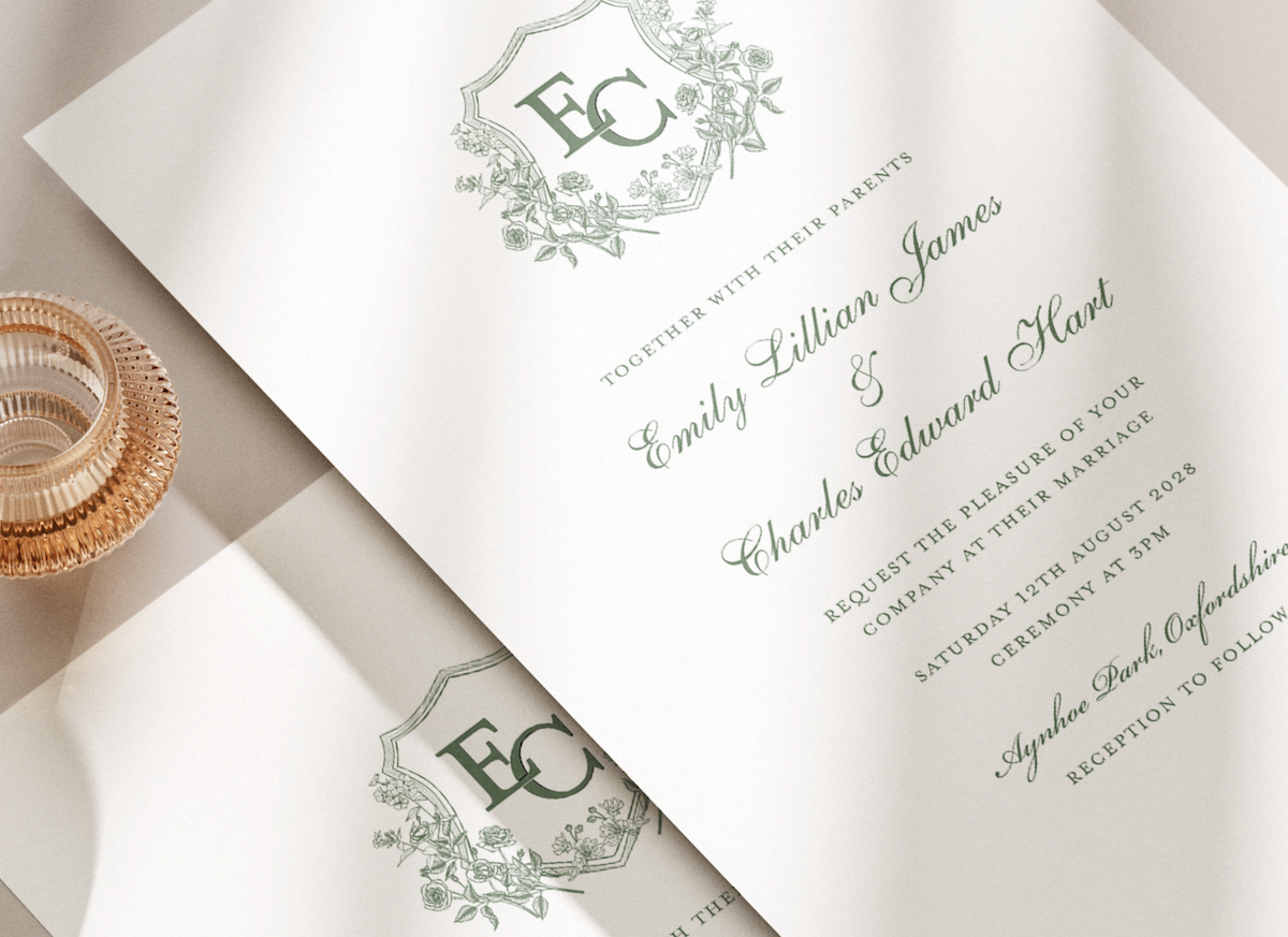 A timeless invitation design inspired by traditional heraldic crests and classic English wedding stationery.